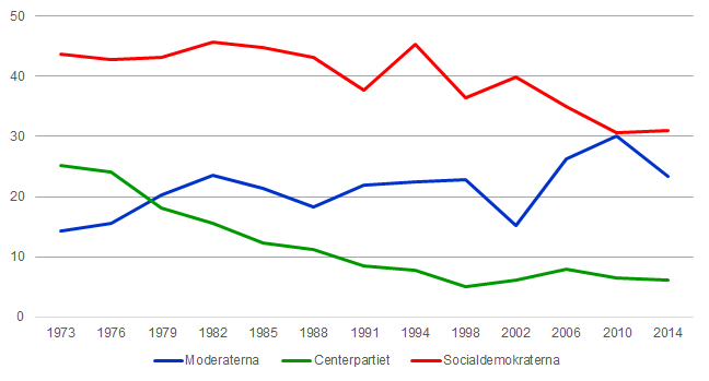 Riksdagsval – Socialdemokraterna, Centerpartiet, Moderaterna. Valresultat, andel röster efter parti och valår, 1973–2014
