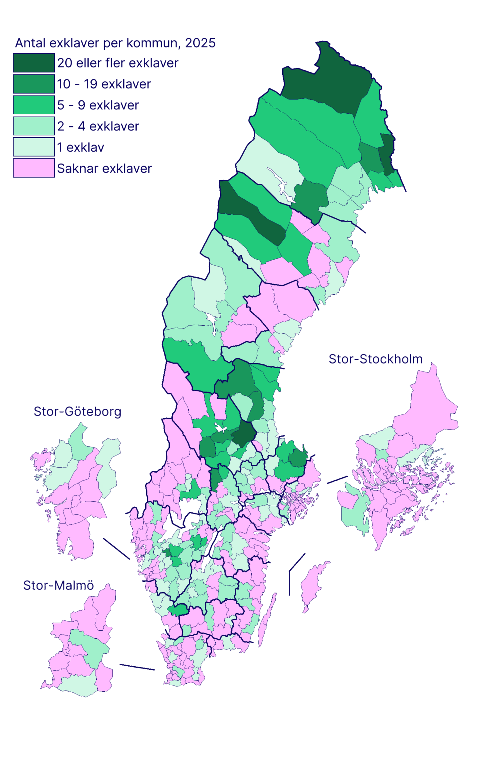 Totalt finns det 671 kommunala exklaver i Sverige, varav 599 också är enklaver, områden som är helt innesluta av en annan kommun. De resterande exklaverna utgör mer komplexa fall. Det kan i vissa fall vara exklaver som inte är helt inneslutna i en annan kommun utan delar sin gräns med flera andra kommuner. Eller i mer unika fall, en enklav som är i en annan enklav som en rysk docka. En mer detaljerad beskrivning finns i faktarutan.