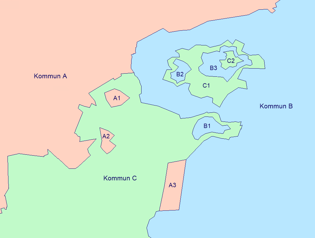 - A1 och A2 är enklaver för kommun C då de helt är innesluta i kommun C.