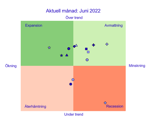 Ett annat sätt att presentera indikatorernas konjunkturutveckling är att markera dem i ett koordinatsystem med fyra kvadranter. Se exemplet nedan som visar juni 2022.