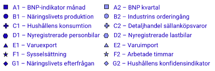 Diagrammet visar att samtliga indikatorer ligger under sin långsiktiga trend. Det råder lågkonjunktur. De flesta indikatorer är på nedgång (recessionsfasen) medan några har vänt uppåt (återhämtningsfasen). Den månatliga BNP-indikatorn befinner sig i recessionsfasen.